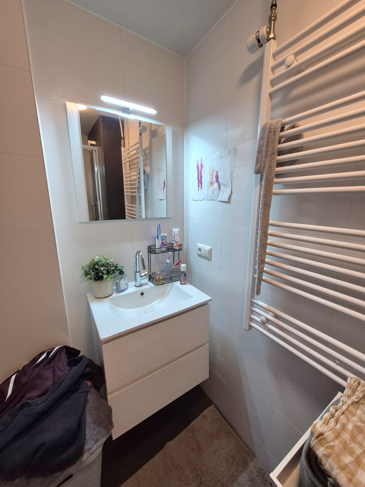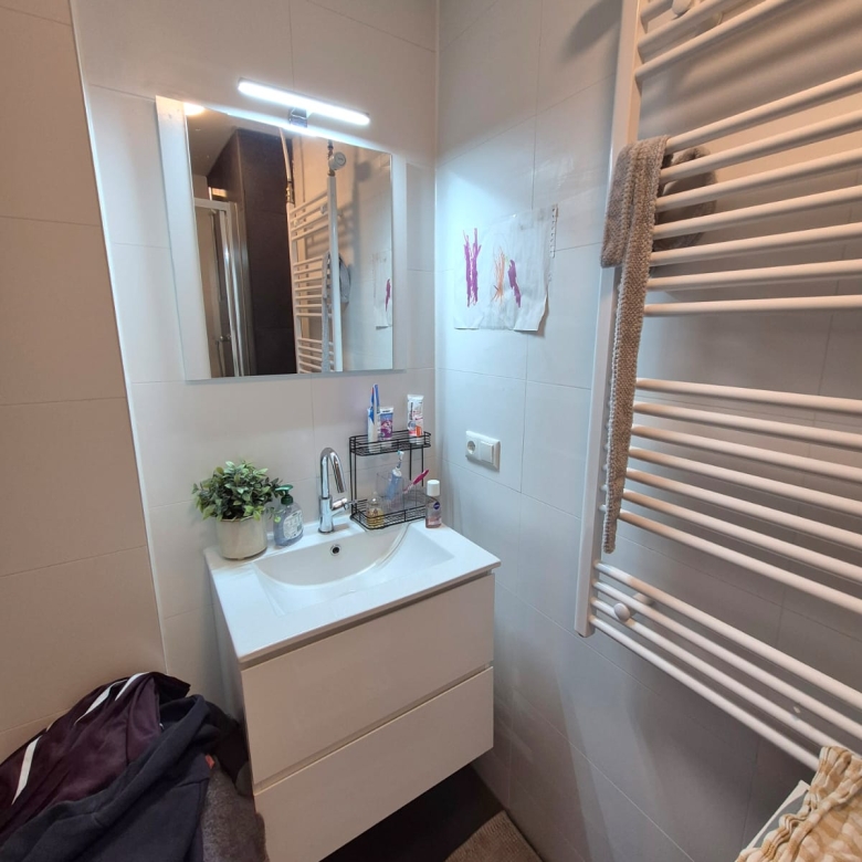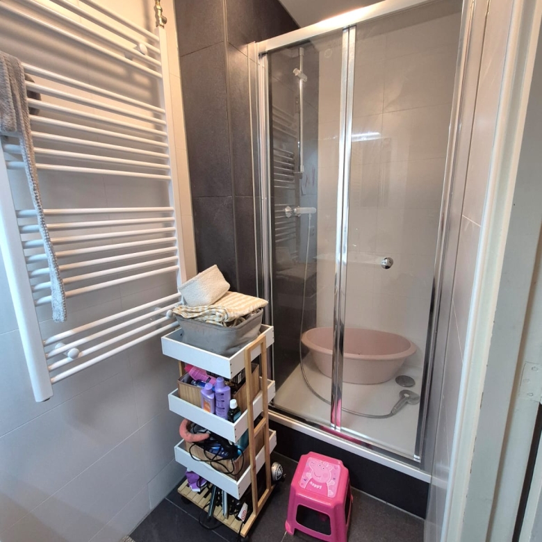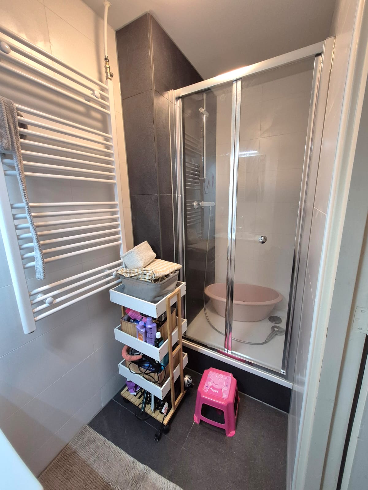 • Netjes gerenoveerde badkamer met wastafelmeubel en handdoekradiator