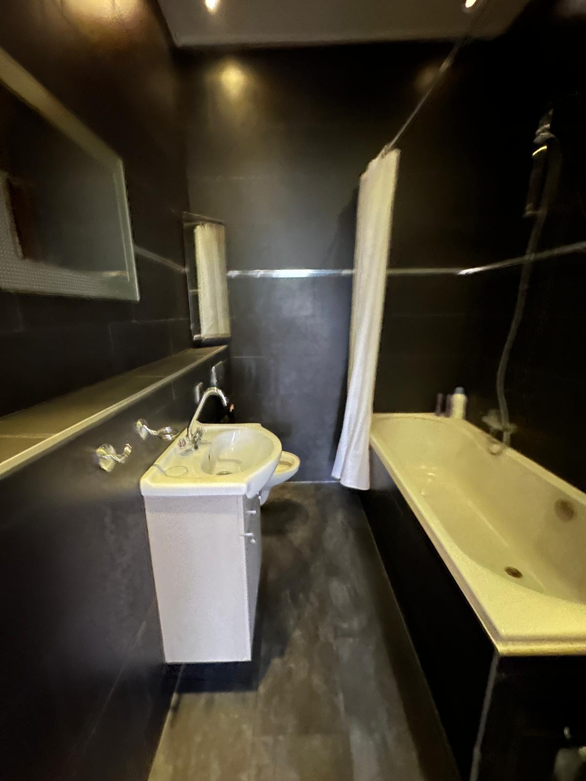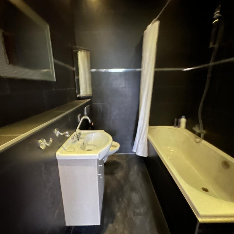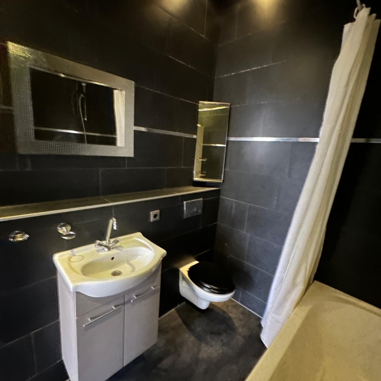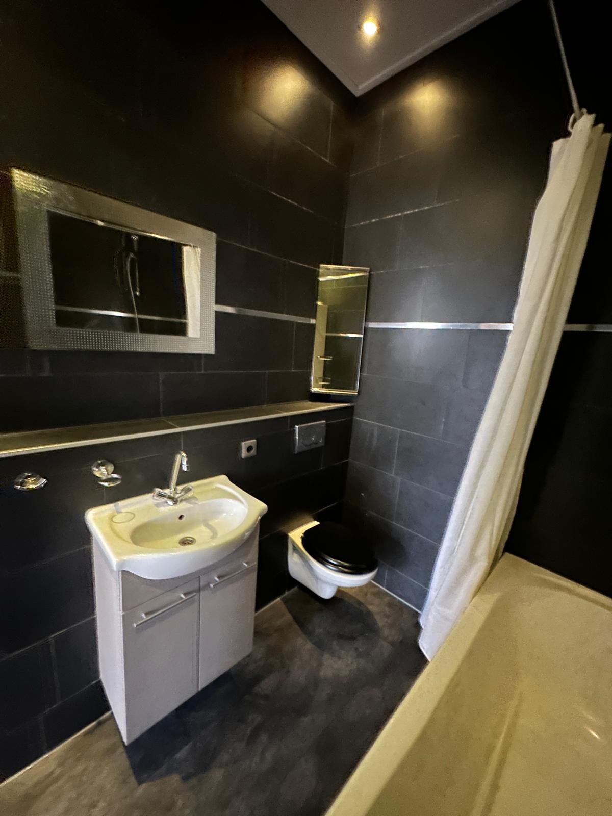 - Badkamer met bad, douche, wastafel, wastafelkast en toilet