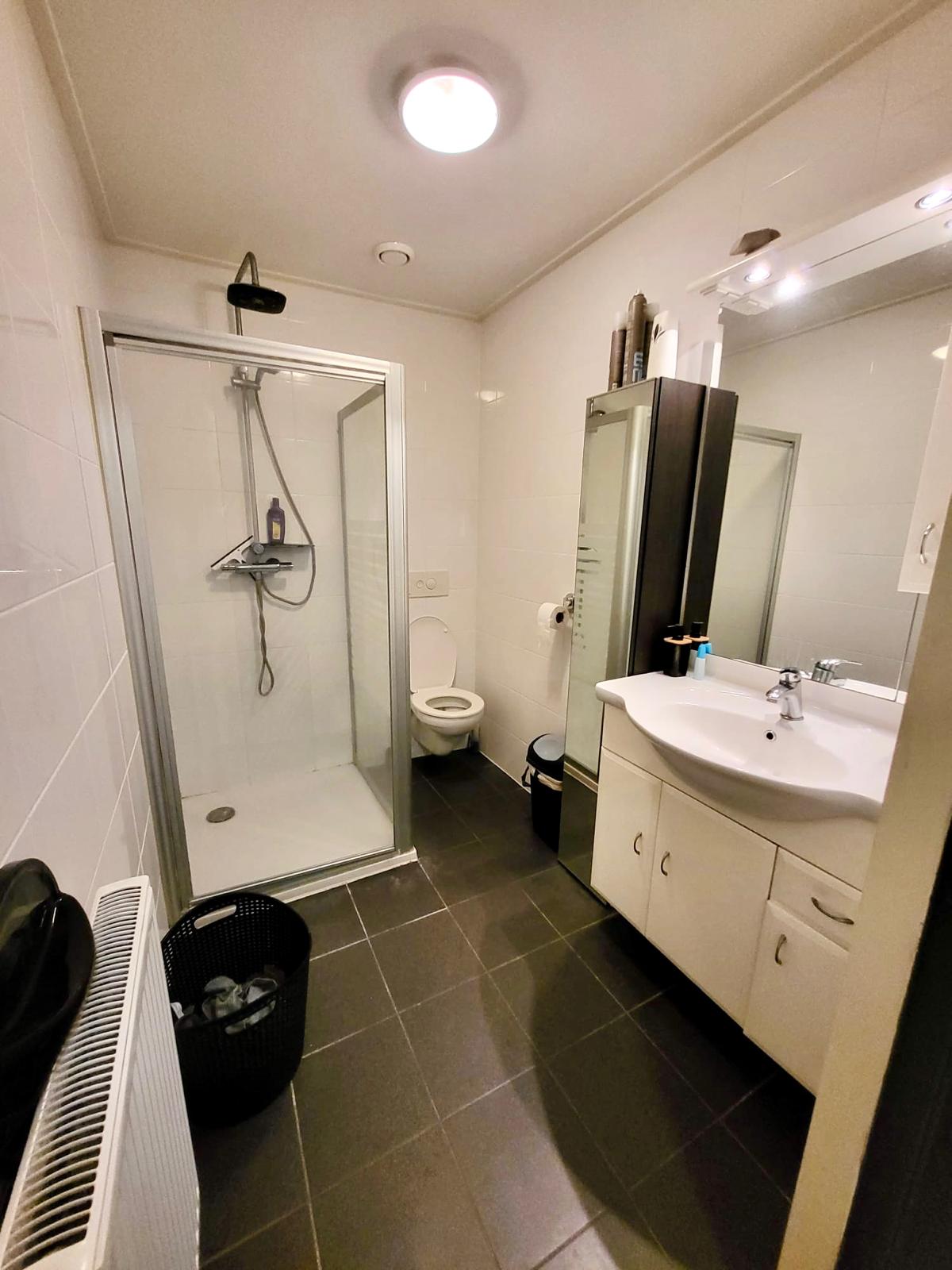 • Badkamer met douche, wastafel, wastafelkast en hangtoilet