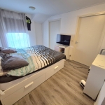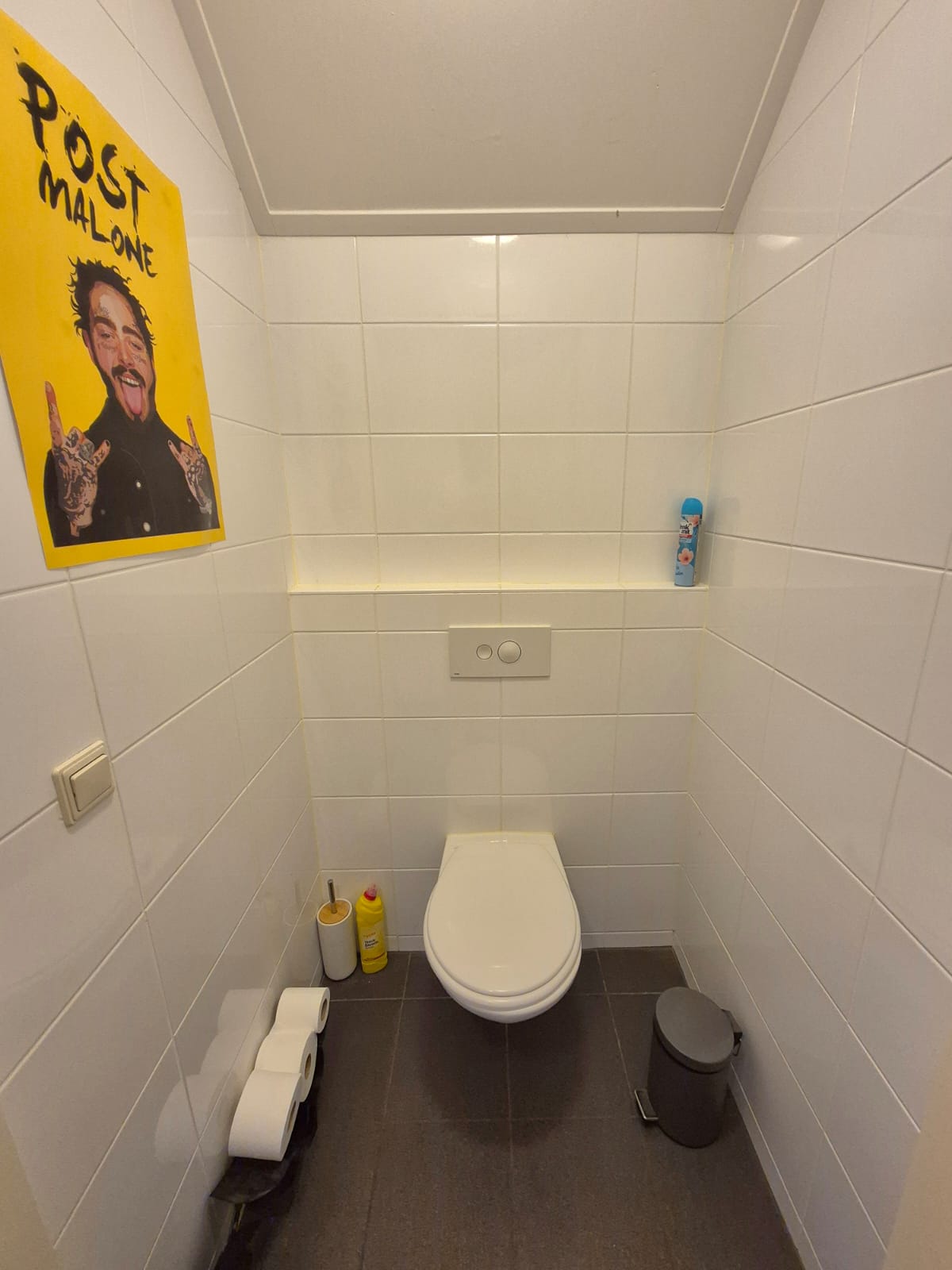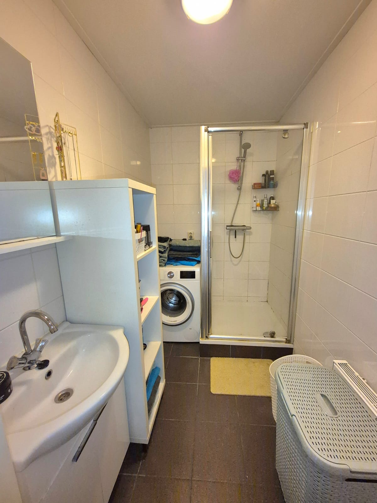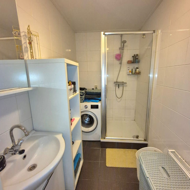 • Badkamer met douche, wastafel, wastafelkast en aansluiting wasmachine